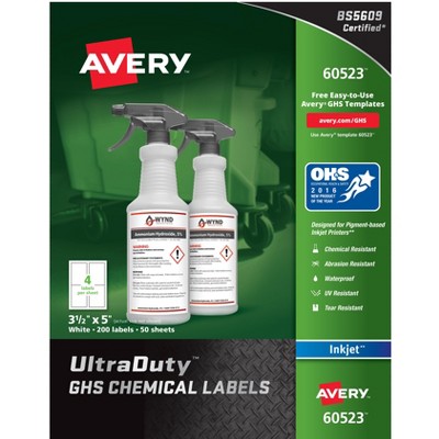 Avery UltraDuty GHS Chemical Labels for Pigment Inkjet Printers, Permanent Adhesive, Waterproof, UV Resistant, 3-1/2" x 5", 200 Labels (60523)