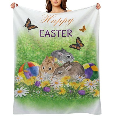 Happy Easter Blanket Easter Rabbit Bunny Eggs Spring Flower Throw Blanket Soft Lightweight Durable Flannel Blanket 40x50 inches