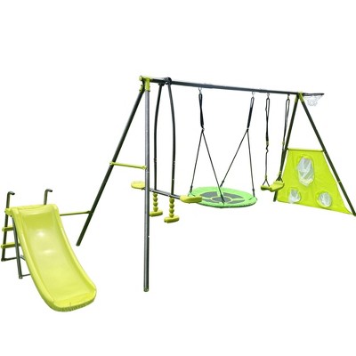 NAYSAYE Playground Slide Swing Set with Net Swing and Mini Slide for Outdoor Backyard Play, Green, 152.49"*53.55"*70.87"