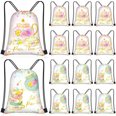 Narwey 24 Pcs Tea Party Drawstring Bags Set Bulk 12 x 10 Inch Spring Themed Bags