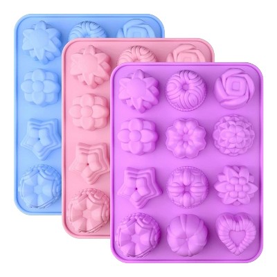Aoibox 3 Pack Silicone Flower Molds for Chocolate, Cupcake, Candy, Jelly, Ice Cube, Muffin - 12 Cavities Different Shapes (Pink, Purple, Blue)