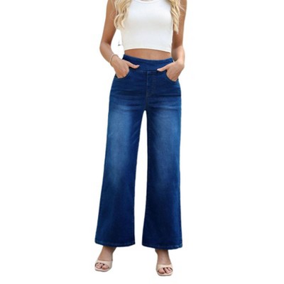 Coolmee Women's Straight Wide Leg Jeans Pull On High Waisted Baggy Jeans Elastic Waist Stretchy Loose Denim Pants