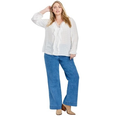 Agnes Orinda Women's Plus Size 3/4 Flare Sleeve V Neck Ruffle Lace Semi Sheer Button Down Shirts