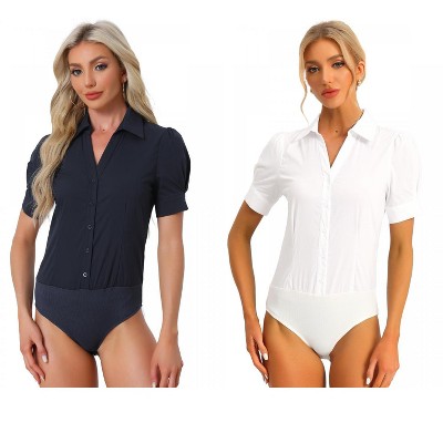 Allegra K Women's Office Button Down One-Piece Short Sleeve Bodysuit Work Shirt 2 Packs