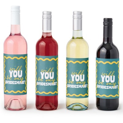 Big Dot of Happiness Teal Green and Yellow Wavy Will You Be My Bridesmaid Wine Labels for Bottles Retro Bridesmaid Proposal Bridal Stickers - Set of 4
