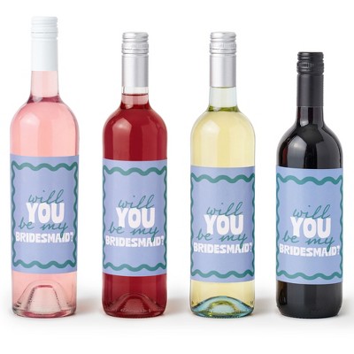 Big Dot of Happiness Blue and Teal Wavy Will You Be My Bridesmaid Wine Labels for Bottles, Retro Bridesmaid Proposal Bridal Gift Stickers - Set of 4