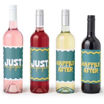 Big Dot of Happiness Teal Green and Yellow Wavy Engagement Party Wine Labels for Bottles, Retro Wedding Gift Decor, Just Engaged Stickers - Set of 4