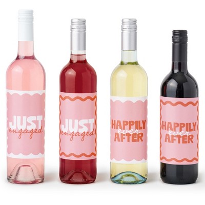 Big Dot of Happiness Pink and Orange Wavy Engagement Party Wine Labels for Bottles, Retro Wedding Gift Decorations, Just Engaged Stickers - Set of 4