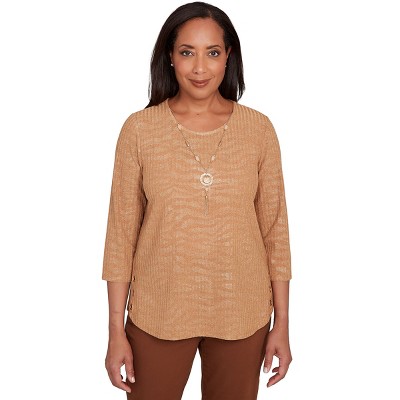 Alfred Dunner Womens Petite Shimmer Animal Jacquard Top With Necklace , Cognac , Size PL