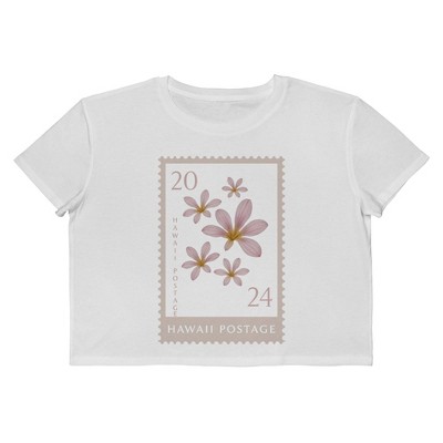 Rerun Island Women's Hawaii Postage Flowers Short Sleeve Graphic Cotton Cropped Loose T-shirt - Bright White XL