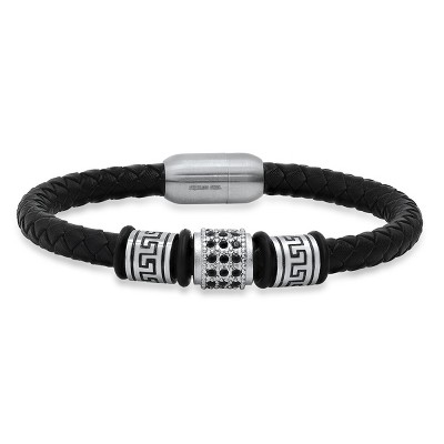 Steeltime Men's black braided leather, stainless steel and black simulated diamonds accents bracelet