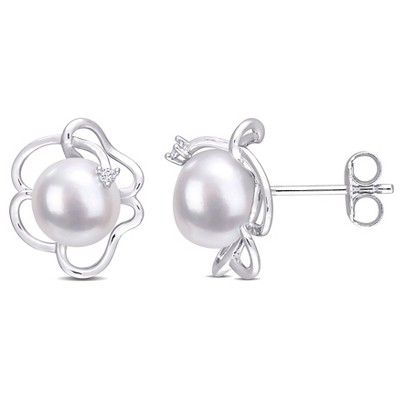 EVERLY JEWELRY | Sterling Silver 7.5 - 8 MM Cultured Freshwater Pearl and Created White Sapphire Floral Stud Earrings