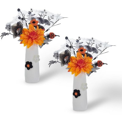 Black and Orange Halloween Flower Arrangement (2 PCS) with Vase - Artificial Dahlia, Eyeball Flower, and Pumpkin Bouquet for Table Decor