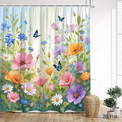Nertpow 1PC Colorful Spring Meadow Butterflies Flowers Shower Curtain Polyester Bathroom Decor with 12 Hooks,Spring Special Set for Bathroom Decor.