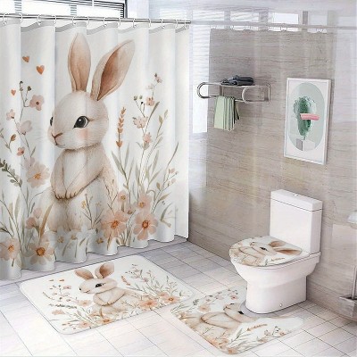 Nertpow 4PCS Easter Patterned Shower Beautiful Watercolor Floral Easter Bunny Shower Curtain Set, Suitable for All-Season Bathroom Decor.