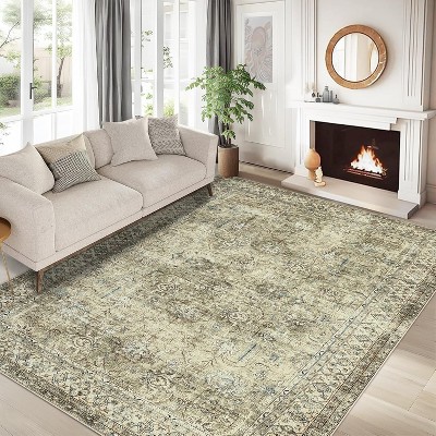 Washable Area Rug - Low Pile, Non-Slip, Floral Boho Design, Soft Faux Wool, Durable & Easy Care,9*12ft, Green