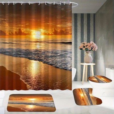Lomsoe 4PCS Golden Sunset Beach Shower Curtain Full Set, Ocean Wave Print, Great for Romantic Bathroom Decor