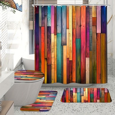 Lomsoe 4PCS Rainbow Vertical Wood Stripe Shower Curtain Full Set, Rustic Colorful Print, Great for Modern Bathroom Decor