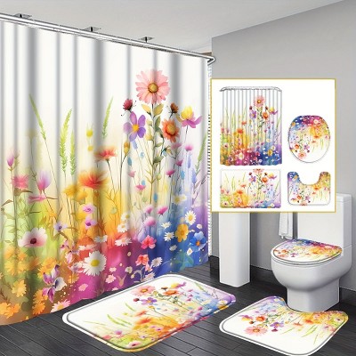 Lomsoe 4PCS Bright Multicolor Wildflower Shower Curtain Combo, Cheerful Floral Design, Suitable for Fresh Bathroom Decor.