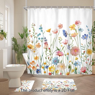 Lomsoe 4PCS Elegant Wildflower Shower Curtain Bundle, Soft Pastoral Print, Ideal for Fresh Bathroom Decor