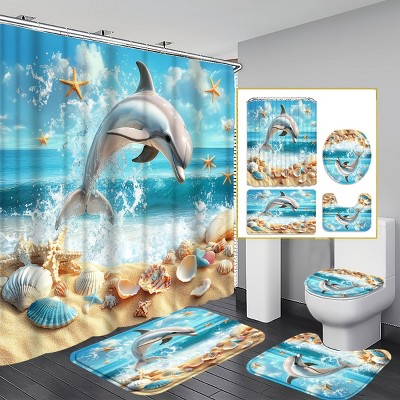 Lomsoe 4PCS Ocean Dolphin Bathroom 4 Piece Set, Nautical Shower Curtain, Beach-Themed Bath Mats, Coastal Decor