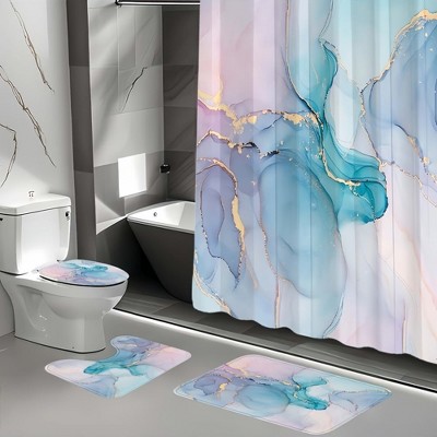 Lomsoe 4PCS Ink Wash Marble Bathroom 4 Piece Set, Elegant Shower Curtain, Absorbent Mat, Modern Decor