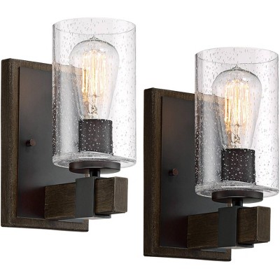 Franklin Iron Works Poetry 9" High Farmhouse Rustic Wall Sconces Light Lamp Fixture Mount Set of 2 Bathroom Hardwired Clear Bronze Seeded Glass Shade