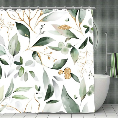 Green and Gold Leaf Shower Curtain, Sage Eucalyptus Leaves with Gold Branches Botanical Plants Fabric Bathroom Curtain Waterproof 70.8x70.8Inch