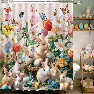 Nertpow 1PC Easter Patterned Shower Running Rabbits Easter Bathroom Decor Waterproof With Pink Flowers Bath Curtain Include Hooks.