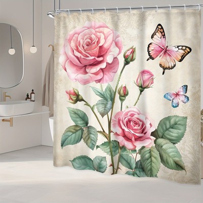 Lomsoe 4PCS Pink Rose Butterfly Shower Curtain 4-Piece Set, Romantic Floral Print, Waterproof Bathroom Accessory Set