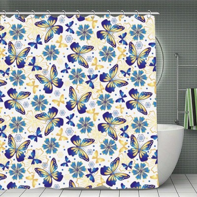 Soscooter Blue Yellow Butterflies With Floral Accents Shower Curtain for Bathtub Shower Window Room Divider Polyester Bathroom Decor 70.8x70.8Inch