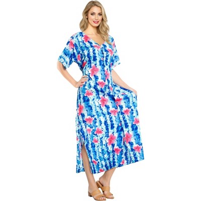 LA LEELA Womens Vacation Beachwear Mini Bathing Suit Summer Loose Beach Dress Fall Swimsuit Cover Ups 1X-2X Blue, Floral
