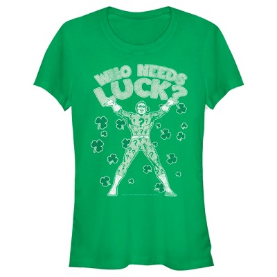 Juniors Womens Batman St. Patrick's Day Riddler Who Needs Luck Distressed T-Shirt