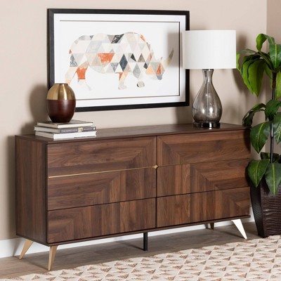 Baxton Studio Graceland Wood 6 Drawer Dresser Walnut Brown/Gold: Mid-Century Storage, Angled Legs