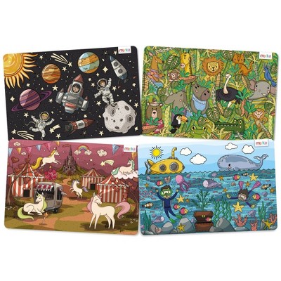 Merka Kids Wipeable Plastic Placemats for Dining Table - Ocean, Space, Jungle, Unicorns for Ages 2 and Up, Set of 4