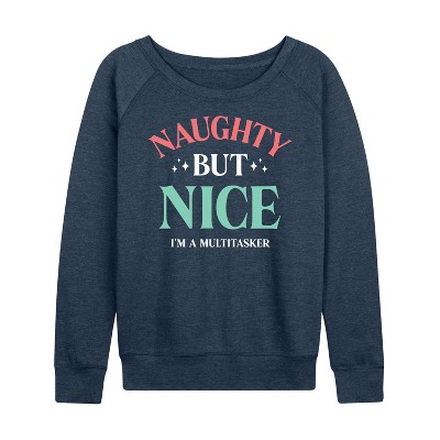 Women's - Instant Message - Naughty But Nice Multitasker Christmas Lightweight French Terry Wide Neck Long Sleeve Graphic Shirt