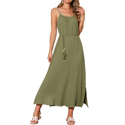 INSPIRE CHIC Women's Summer Linen Tie Waist Spaghetti Strap Cami Beach Maxi Sundress