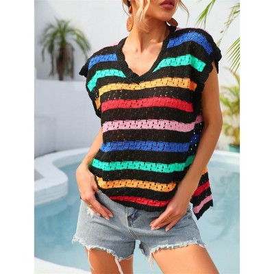 Women's Rainbow Stripe V-Neck Crochet Hollow Out Knit Sleeveless Cover Up Shirt Summer Casual Vacation Beach Top Blouse