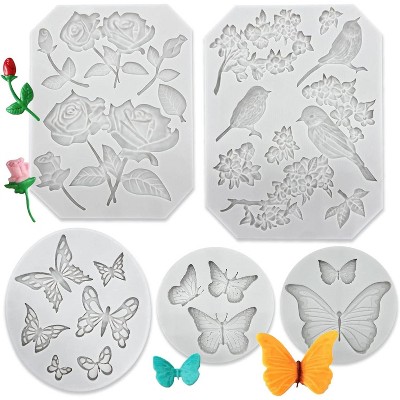 JDICTION 5Pcs Butterfly Rose Flower Stem Bird Blossom Silicone Fondant Molds for Making Chocolate Fondant Jelly Polymer Clay Cake Decoration