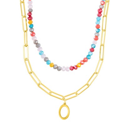 Adornia 14k Gold Plated Adjustable Layered Color Beads and Paperclip Chain Initial Necklace