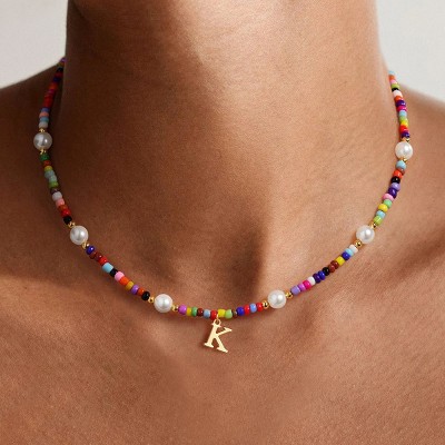 Summit Adventure Colorful Beaded Necklaces for Women - 14K-Gold-Plated Boho Initial Pearl Pendent Necklace Trendy