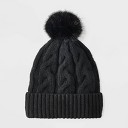 CTM Women's Cable Knit Lined Winter Beanie with Synthetic Fur Pom