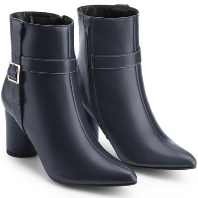 BLISSFUL STEP Women's Pointed Toe Block Chunky Heel Buckle Decor Ankle Booties