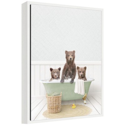 Kate and Laurel Three Bear Cubs in Cottage Green Bath Framed Canvas by Amy Peterson, 18x24, White