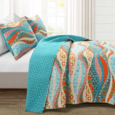 Boho Floral Reversible Oversized Quilt & Sham Set Turquoise/Orange - Lush Décor