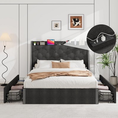 Orieon Upholstered Storage Bed Frame with 4 Drawers, Adjustable Headboard, Linen Platform Bed, Black
