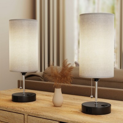 PAIHOME Modern Bedside Table Lamp Set with USB, Black Base Decorative Desk Lamp, Pull Chain Switch, Beige Linen Drum Shades for Bedroom Living Room