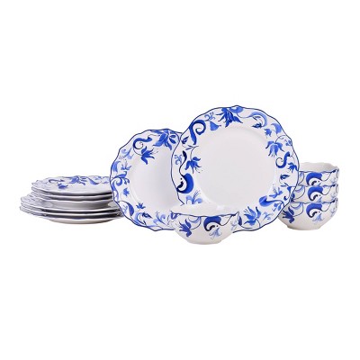 222 Fifth 12pc Ayla Dinnerware Set Reactive Blue: Porcelain, Floral Pattern, Vintage Style, Dishwasher & Microwave Safe