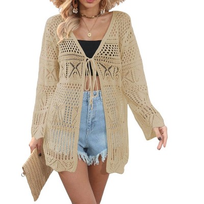 Women Crochet Cardigan Tie Front Long Sleeve Lightweight Cover Up Oversized Hollow Out Summer Cardigans