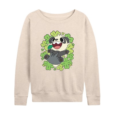 Women's - Pokémon - Pancham Shamrocks Collage Lightweight French Terry Wide Neck Long Sleeve Graphic Shirt